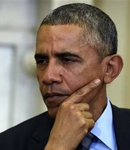 FILE - In this March 9, 2015, file photo, President Barack Obama listens during his meeting with European Council President Donald Tusk in the Oval …
