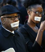 George Henderson, left, professor emeritus, joins students at the University of Oklahoma to protest a fraternity's racist comments on March 9, 2015 in Norman, Okla. …