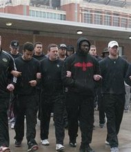 The University of Oklahoma football team and coaches line up wearing all black in the Everest Training Center in protest of the Sigma Alpha Epsilon …