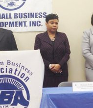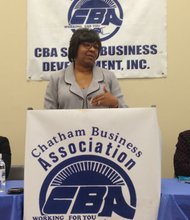 Gwen Shaw, Assistant Secretary, Chatham Business Association (CBA) (left) and Melinda Kelly Executive Director, Chatham Business Association (CBA) (right) listen to Ald. Michelle Harris (8th …
