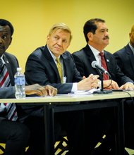 L-R Chicago mayoral candidates Dr. Willie Wilson, Ald. Bob Fioretti (2nd Ward), Cook County Commissioner Jesus "Chuy" Garcia and William "Doc" Walls. Photo: John Alexander