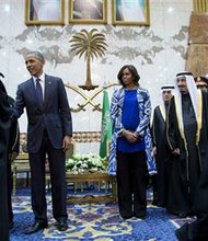 President Barack Obama and first lady Michelle Obama participate in a delegation receiving line with the new Saudi Arabian King, Salman bin Abdul Aziz, in …