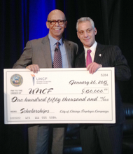 Dr. Michael L. Lomax, Ph.D, President and CEO, United Negro College Fund (UNCF) and Chicago Mayor Rahm Emanuel hold a check from the City of …