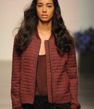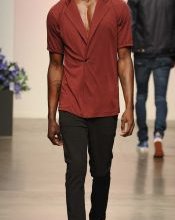 A model wears a marsala-hued jacket in the En Noir fashion show during Mercedes-Benz Fashion Week's Spring 2015 collections.