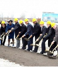 Pictured 6th and 9th from left, U.S. Cong. Bobby Rush and Ald. Willie B. Cochran take part in the groundbreaking ceremony for St. Bernard Hospital’s …