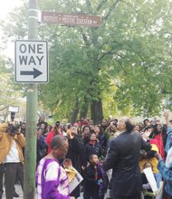 Ald. Michelle Harris (Dist.-8) (center) joined Institute of Positive Education founders at the unveiling of the organization’s honorary street sign Oct. 24, 2014 on the …