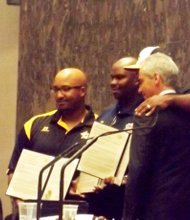 Chicago Mayor Rahm Emanuel poses for pictures with the coaches from the Jackie Robinson West All Stars during last week's Chicago City Council Meeting where …
