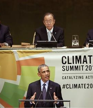 United States President Barack Obama addresses the Climate Summit, at United Nations headquarters, Tuesday, Sept. 23, 2014. (AP Photo/Richard Drew)