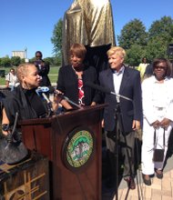 Sculptor Deborah Hand (far left) spoke at Dunbar Park, 200 E. 31st St., before the unveiling of her Paul Laurence Dunbar statute on September 6, …