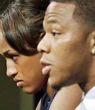 In this May 23, 2014, file photo, Janay Rice, left, looks on as her husband, Baltimore Ravens running back Ray Rice, speaks to the media …