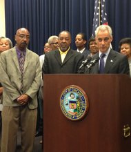 Chicago Mayor Rahm Emanuel (right) stands with Chicago Football Classic (CFC) co-founders, Larry Huggins and Everett Rand (far left), during a press conference about the …