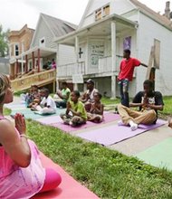 I Grow Chicago, yoga instructor, Tameka Lawson, leads a class outside the house at 64th and Honore in Chicago’s Englewood community.