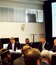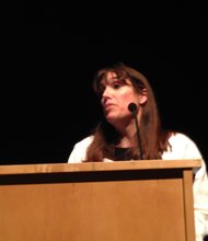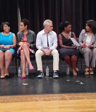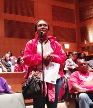 Ginger Ostro, Budget and Grants Officer, Chicago Public Schools (CPS), outlined specific budgetary items during a meeting at Kennedy King College on CPS’s FY15 budget.