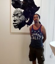 Artist Lobyn Hamilton, a featured artist in Gallery Guichard’s Genesis exhibition, seen here with one of his signature broken vinyl works, a black and white …