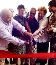 Artists Frances and Andre Guichard, pictured center, take part in the ribbon cutting ceremony of their newly opened, Gallery Guichard on 47th Street in Chicago, …
