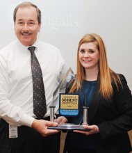 Ingalls President and CEO, Kurt Johnson, accepting Healthgrades 50 Best Hospitals Award from Stacy Poole from CPM Healthgrades.