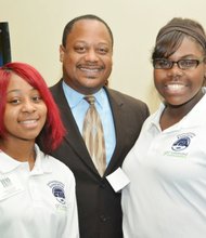 Get Connected IT Ambassadors Nessce Colwin (left) and Diedre Harbin pose with Ald. Roderick Sawyer (6th Ward) during the SSA #51 3rd Annual Holiday Mix …