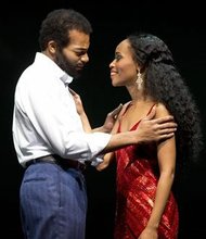 Brandon Victor Dixon as Berry Gordy, left, and Valisia LeKae as Diana Ross in "Motown: The Musical," performing at the Lunt-Fontanne Theatre in New York. …