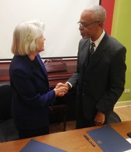 Dr. Sharon K. Hahs, President, Northeastern Illinois University and A. Patrick Augustin, Executive Director, Pan-African Association shake hands after establishing an official partnership between their …