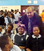 Faren D'Abell, principal of Frazier International Magnet School poses with students who attended a school assembly last Thursday where Rev. Al Sharpton and Isaiah Thomas …