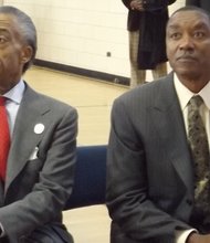L-R: Civil Rights Leader and Radio/Television Talk Show Host, Rev. Al Sharpton sits next to former NBA star, Isiah Thomas, during a special assembly held …