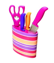 On the Cutting Edge The Farberware Universal Block Cutlery Set comes in a brightly colored block filled with flexible rods instead of pre-drilled holes, so …
