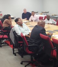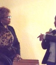 (L-R) Karen Yarbrough, Cook County Recorder of Deeds, listens as a South Side resident talks to her about property and deed fraud during an event …