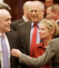 Illinois Rep. Greg Harris, D-Chicago, left, is congratulated by lawmakers as gay marriage legislation passes on the House floor during veto session Tuesday, Nov. 5, …