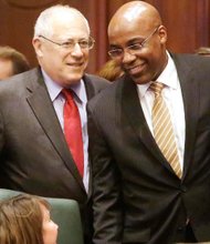 Illinois Gov. Pat Quinn, left, and Illinois Sen. Kwame Raoul, D-Chicago, right, look on as gay marriage legislation passes on the House floor during veto …