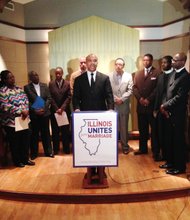 (Foreground) Rev. Dr.Delman Coates speaking at a press conference held at the Chicago Temple, 77 W. Washington, to lend his support for same sex marriage. …
