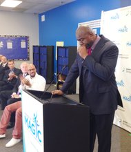 An emotional Earvin “Magic” Johnson speaks about his desire to help at-risk youth in need of an education as entertainer Common (middle) and Ill. Gov. …
