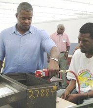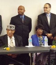 L-R back row, Community activists Otis Porter, Meldan Langford and Miguel Bonilla were on hand to serve centenarians who were honored Friday during an event …