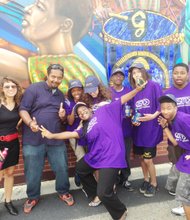 Mural designer, Rahmaan “Statik” Barnes and After School Matters student painters infront of their mural.