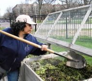 Renelda Gardner, a grower/instructor with the Chicago Botanic Garden's Green Youth Farm program, tends to a compost pile in a garden next to Dyett High …