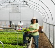 Renelda Gardner of the Chicago Botanic Garden holds a head of lettuce grown in a clay pot container. Gardner is an instructor/grower with the Botanic …
