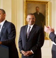 President Barack Obama announces Mayor Anthony Foxx, of Charlotte, N.C., as his nominee for Transportation Secretary, in the East Room of the White House, April …