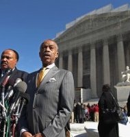 Pictured from left: Martin Luther King III and Rev. Al Sharpton, founder and president of civil rights organization, National Action Network, talk to reports outside …